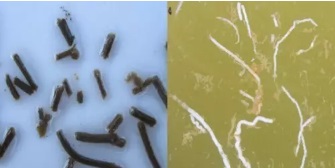 对虾白便的主要症状表现为:肠壁细胞增生、粘膜上皮畸变脱落、肠道逐渐发空变白、肝胰腺体萎缩。脱落的腺管上皮、肠道黏膜上皮和增生细胞随粪便排出,形成“白便”附着在料台上或者漂浮于水面。“白便”外观细长呈白色,如棉线、有粘性、严重时成片漂在水面、有恶臭味。初始阶段对虾摄食正常,甚至出现暴食,但很快随着病情加重,出现空胃、趴边或偷死。