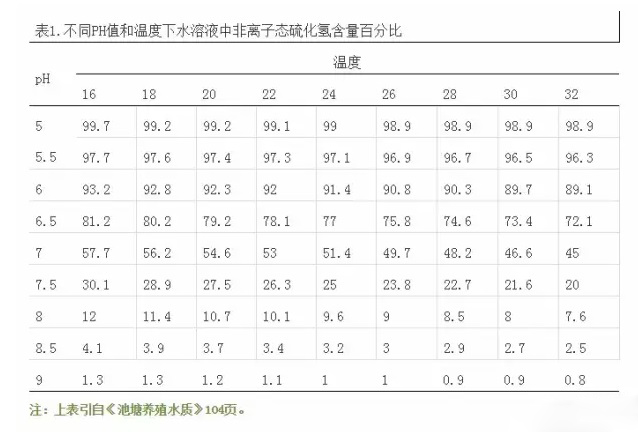 在养殖水体中,硫化氢的存在形态主要受水体pH和温度的影响,在酸性条件下,在酸性条件下以非离子态硫化氢为主,在碱性条件下主要以离子态硫化氢为主。水体不同温度和pH条件下非离子态硫化氢的含量可见表1。