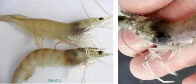 在发病的初期,虾鳃呈淡黄色。随着病情的发展,鳃丝更加肿大,呈松散状,并由黄色变为黄褐色,形成斑块;鳃组织变脆,甚至糜烂,严重发展成烂鳃,很难恢复。病虾体色转暗,鳃区甲壳内侧变黄。第二触鞭变红易断,甲壳上有黑色溃疡或黑斑,肌肉白浊,有些对虾的游泳足变红。