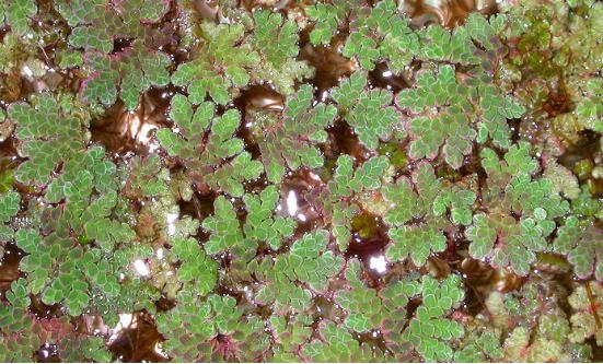 生长在水田或池塘中的小型浮水植物。幼时呈绿色,生长迅速,常在水面上长成一片。秋冬时节,它的叶内含有很多花青素,群体呈现一片红色,所以叫做满江红。个体很小,径约1cm,呈三角形、菱形或类圆形。根状茎细弱,横卧,羽状分枝,须根下垂到水中。叶细小如鳞片,肉质,在茎上排列成两行,互生;每一叶片都深裂成两瓣:上瓣肉质,浮在水面上,绿色,秋后变红色,能进行光合作用;下瓣膜质,斜生在水中,没有色素;孢子囊果成对生于分枝基部的沉水叶片上。满江红常与蓝藻中的项圈藻(鱼腥藻)共生,项圈藻能固定大气中的氮气。因此,满江红可以作为水稻的优良绿肥,也可作鱼类和家畜的饲料。