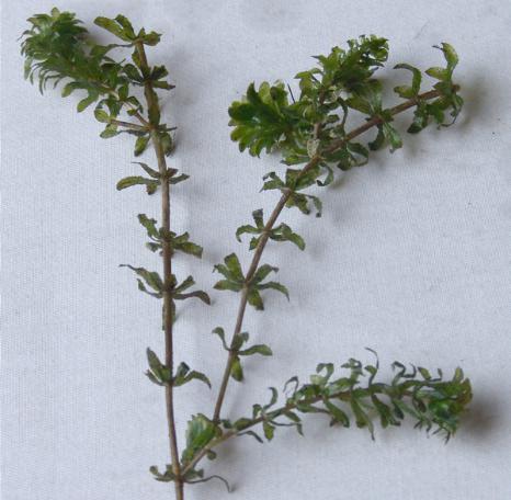 轮叶黑藻俗称蜈蚣草、温丝草、灯笼薇、转转薇等,轮叶黑藻为雌雄异体,花白色,较小,果实呈三角棒形。秋末开始无性生殖,在枝尖形成特化的营养繁殖器官鳞状芽苞,俗称"天果",根部形成白色的"地果"。冬季天果沉入水底,被泥土污物覆盖,地果入底泥3~5厘米,地果较少见。冬季为休眠期,水温10℃以上时,芽苞开始萌发生长,前端生长点顶出其上的沉积物,茎叶见光呈绿色,同时随着芽苞的伸长在基部叶腋处萌生出不定根,形成新的植株。待植株长成又可以断枝再植。目前在河蟹养殖池塘中进行人工栽培。
