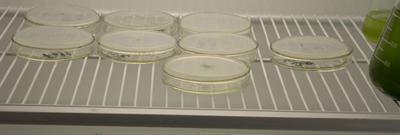 5.平板分离法在培养液中加入占培养液1.5%的琼胶,加热溶解后,注入培养皿中,加盖后用15磅压力121℃灭菌20分钟,即制成胶质培养基(也可用硅酸胶和明胶制备)。在琼胶培养基放在40℃以下的水浴锅内,开改用吸管注入混合藻液,摇匀,使之分散在培养基平面上。之后,可放在恒温箱内,用荧光灯照射,使藻群生长。再经镜检,反复此法不断提纯,即可分离出较纯的藻种。
