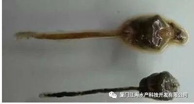 实验室发现,“白便”的主要成分为肝胰脏排出的病变组织、粘液和毒液,肠道脱落的粘膜以及一些正常的粪便成分,而不是人们常认为的虾白色粪便。我们从中检测出大量的副溶血弧菌、哈维氏弧菌等,这些治病菌聚集在池塘底部,附着在饲料、残饵、有机碎屑、死藻上不断繁殖生长。对虾吃食这些物质后,通常引起胃肠道感染、肝胰脏萎缩或肿大。